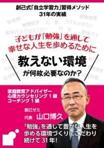 学習習慣 不登校 発達障害? 学校苦手 勉強嫌い 勉強苦手 内 気 内 気 元 気 勉強得意 勉強好き やる気が出ない 勉強方法が分からない 続かない 家庭教育アドバイザー 心理カウンセリング 1 級 コーチング 1 級 創己ゼミ 代表 山口博久 「勉強」を通して豊かな人生を 歩める環境づくりにこだわり 続けて31年! 教えない環境 が何故必要なのか? 創己式「自立学習力」習得メソッド 31年の実績 教えない環境が何故必要なの か 山口博久